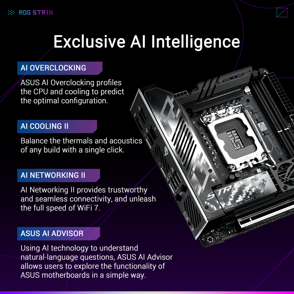 The ASUS ROG Strix Z890-I Gaming WiFi LGA1851 ITX Motherboard is a compact powerhouse, designed for gamers who need maximum performance in a small form factor. It supports Intel's latest processors and features PCIe 5.0 and DDR5 memory. With built-in Wi-Fi 6, this motherboard ensures seamless and ultra-fast connectivity for gaming and streaming.