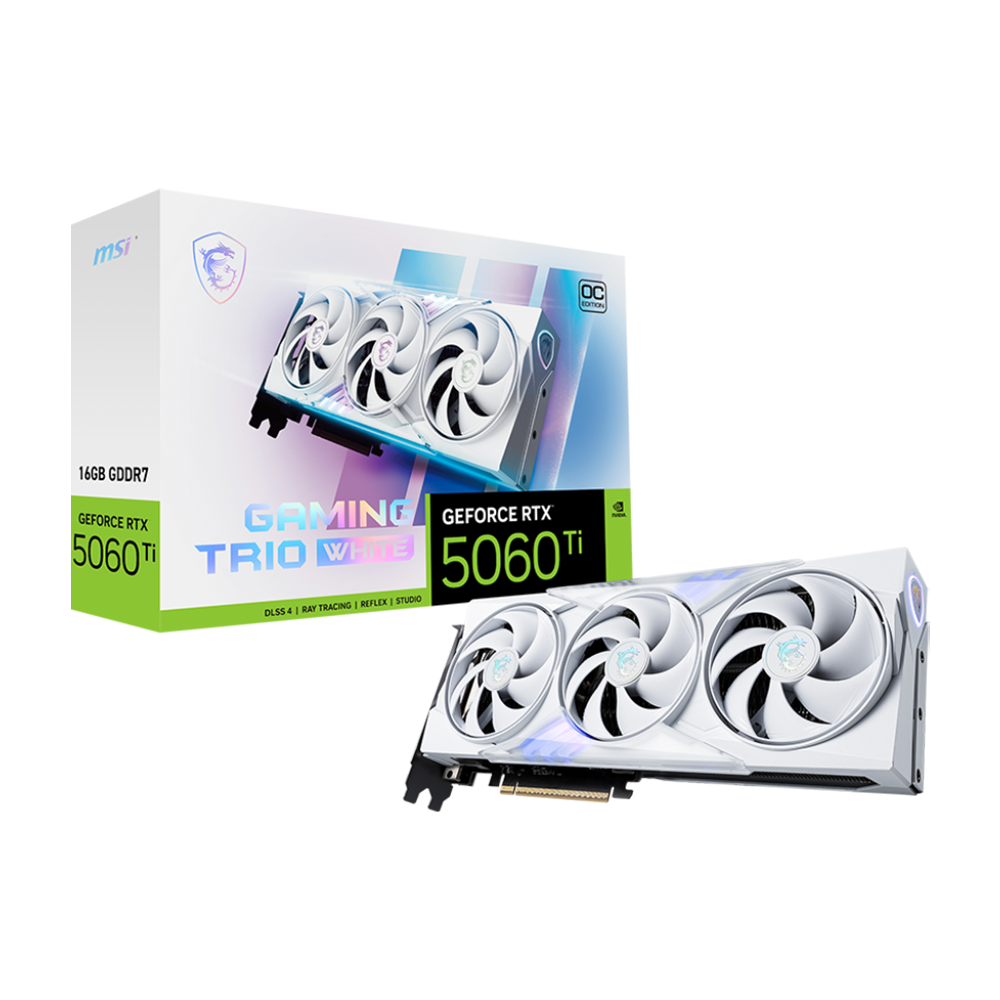 The MSI GeForce RTX 5060 Ti GAMING TRIO OC WHITE 16GB GDDR7 delivers elite 1440p gaming with a 2572 MHz boost clock and 4608 CUDA cores. Featuring 16GB next-gen GDDR7 memory and TRI FROZR 3 cooling, this white edition GPU excels in ray tracing, AI-powered DLSS 3.5, and content creation.